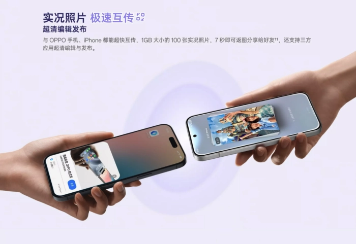 OPPO Reno15 支持与iPhone设备互传实况照片,同时配备NFC“碰一碰”文件互传功能,有效打破不同生态系统间的壁垒。无论与家人还是朋友,都能在不同品牌设备间实现快速、高效、无门槛的文件分享,让日常沟通和内容流转更自由便捷。