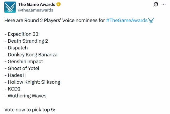 TGA官方宣布,“玩家之声”活动的10强名单已正式公布,第二轮投票目前已启动,票数排名前五的游戏将晋级第三轮投票环节。具体名单如下: