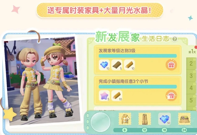 完成游戏公测首个活动“新发展家生活日志”,即可领取相应奖励。