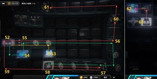 16. 抵达52区后,按下R键开启夜视模式(界面如附图所示)。首先沿黄色路线前往53区,在53区按R键关闭夜视模式后,会自动回到52区。随后沿绿色路线行动:先去54区,再依次前往55、56、57、58区。接着走红色路线,从58区返回57区时,会被57区的机制弹至左侧59区,之后依次前往52、55、56、60、61区,最后进入出现的62区完成传送。注意:关闭夜视模式后将无法看到图中路线,全程需参照夜视模式下的路线图行进。