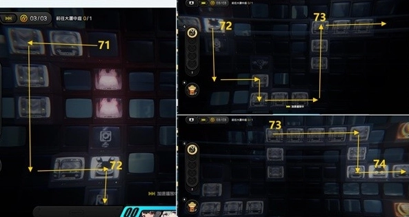19.接着从72区域下走3格,再右走3格进入轨道,经过73区域后到达74区域