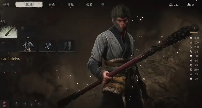 可以看到我们的长条是棍式条,长按重攻击时它能蓄力;等这个蓄力条攒满后,旁边的原点就会亮起——这些原点相当于技能条,后期释放棍子相关技能都要消耗它们。所以这个游戏的战斗核心在于:我们可以通过普通攻击或蓄力攻击积累棍势,等棍势满了就能释放高输出招式。不过现在我们还没有解锁这些,只能用简单的普通攻击,接下来先把这几个小怪解决掉。