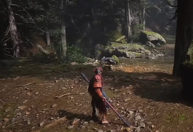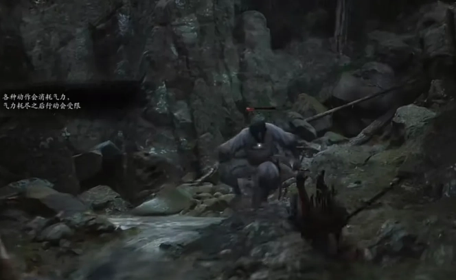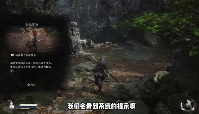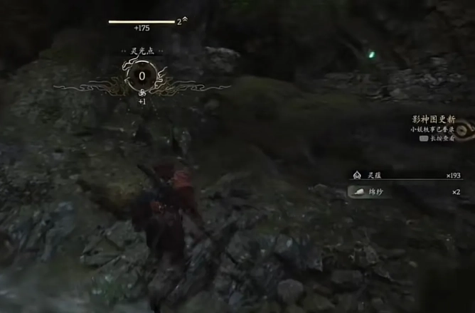 我们可以先长按棍棒蓄力打出重攻击,打它个措手不及,接着疯狂用轻攻击输出;等它要放技能时,赶紧翻滚躲避。解决这个妖怪后,我们能拿到一个灵光点——也就是常说的技能点;旁边的绿光吸收后会获得【灵蕴】,这是游戏里的货币。吸收【灵蕴】还有个额外好处:能补充血瓶(也就是葫芦)的恢复次数。