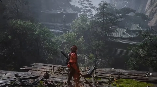 此时来到山顶,我们在悬崖边上可以看到一个蒲团,这是游戏中的一个收集要素,收集后我们可以欣赏一段风景,然后可以获得一个技能点。