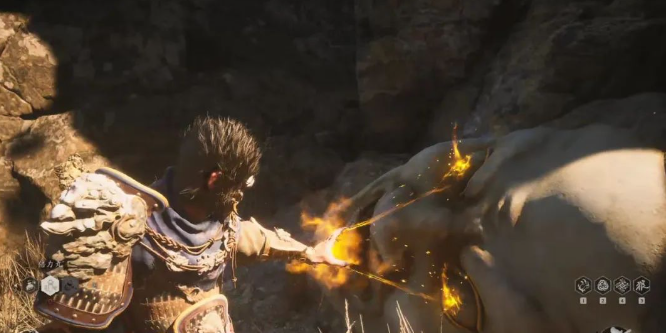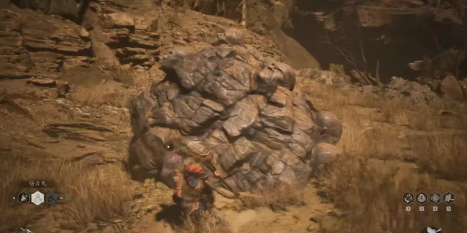 然后按照真言,跳下到沿着山沟走到头,遇到NPC石中人。他说附近山洞里有个石精,让我们帮他出来,接下来我们就去找石母