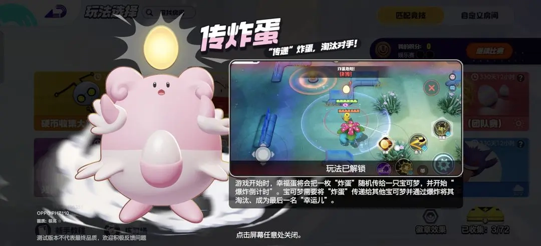 游戏玩法简介:在游戏的起始阶段,幸福蛋会随机选择一只宝可梦并赋予其一枚“炸蛋”,同时启动“爆炸倒计时”。玩家的目标是将这枚“炸蛋”传递给其他宝可梦,并通过引发爆炸来淘汰对手,最终成为唯一的“幸运儿”。