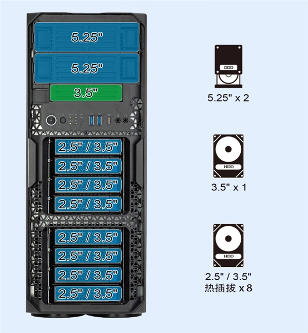 打开前面板后,可看到三段式结构:上方是2个5.25英寸的光驱位,中间设有1个3.5英寸软驱位,下方则配备了8个支持SAS III 12Gbps/SATA III 6Gbps的3.5/2.5英寸热插拔硬盘托架。
