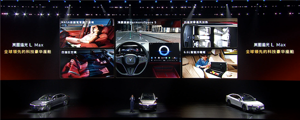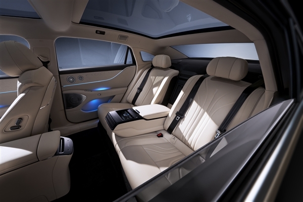 全系标配云朵座椅,四座均配备通风、加热及10点按摩功能;此外还搭载6.6L智能冷暖冰箱、23扬声器音响系统、后排8英寸触控屏、四温区独立空调、256色动态氛围灯、带遮阳帘的全景天幕以及四门电吸装置。
