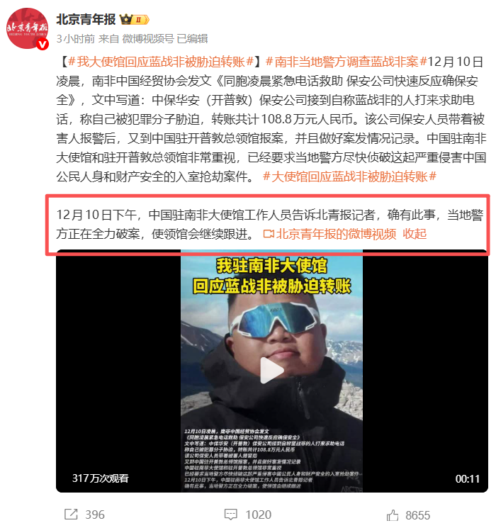 3、蓝战非已经及时报警,南非警方明确表示 “正在全力破案”,中国驻南非领事馆也会持续跟进事件进展,绝不会不了了之。