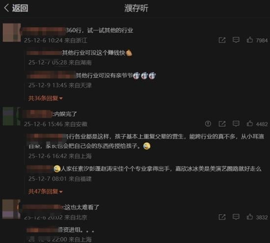 不少网友认为这位星三代一露面就“栽了跟头”,评论区里有网友留言:“老师,这样的颜值实在不太适合混娱乐圈”“怕不是带资进组吧”“还是支持她去做别的事业比较好”“孩子这长相可不能走偏了路”等等。