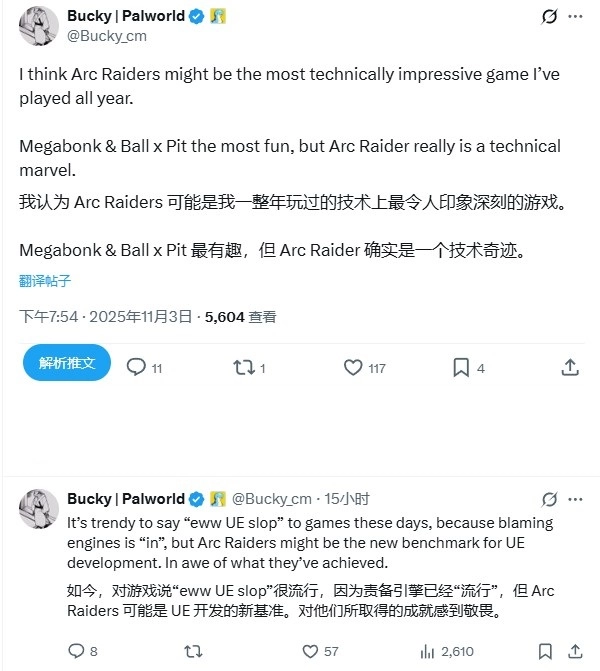 爆款游戏《幻兽帕鲁》的开发商Pocketpair社区经理,近日分享了试玩《ARC Raiders》的体验。该团队开发者John Bucky称,Embark工作室推出的这款全新射击游戏堪称“技术奇迹”,有望为虚幻引擎5打造的游戏树立新的行业标杆。