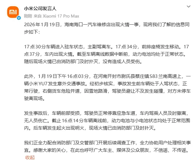 1月20日,“小米公司发言人”发布文章,就海南维修店火情以及河南YU7高速事故作出了回应。
