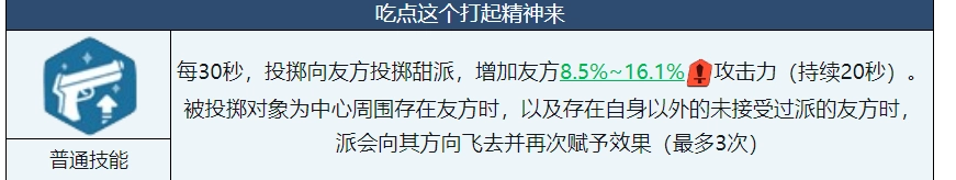 小夏的基础技能是朝距离自己最近的队友投掷馅饼,能让队友攻击力提升8.5%至16.1%。要是首次投掷就命中队友,这馅饼还会从该队友身上弹射到其他队友那里,最多可弹射三次。说白了,这就是个增强队友攻击力的技能,效果持续20秒。