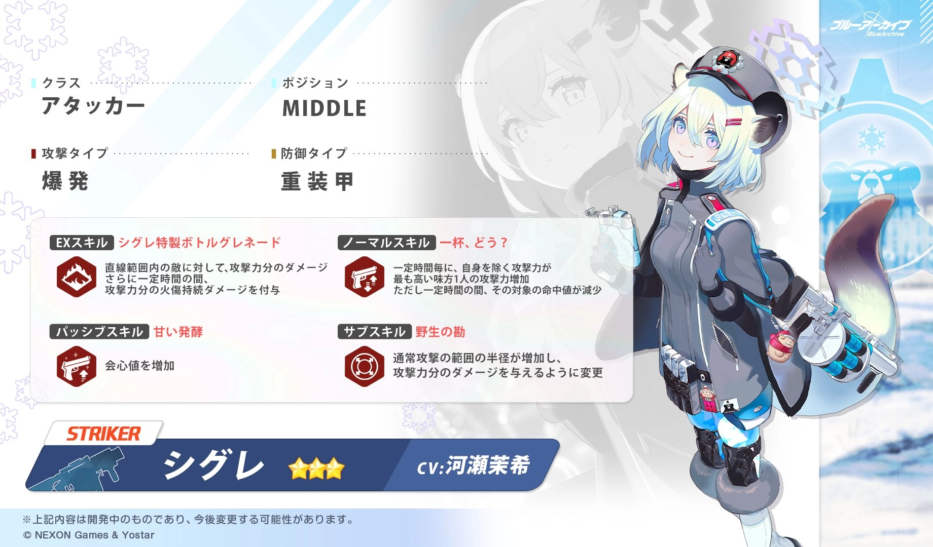 对自制饮料抱有浓厚兴趣的时雨同学,其EX技能是朝敌人投掷特制的瓶状手榴弹,这不仅会引发燃烧,造成基于自身攻击力百分比的伤害,还能额外附加持续伤害效果。