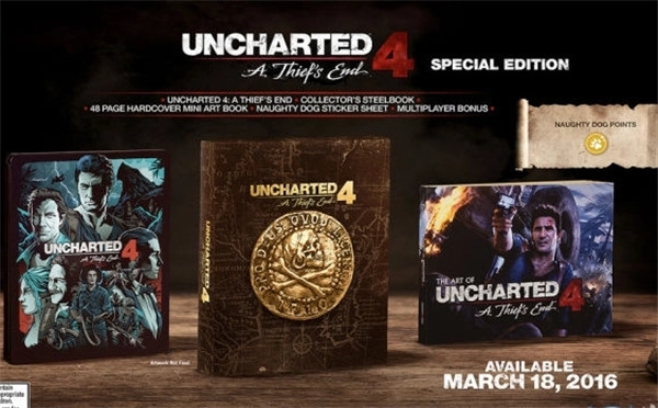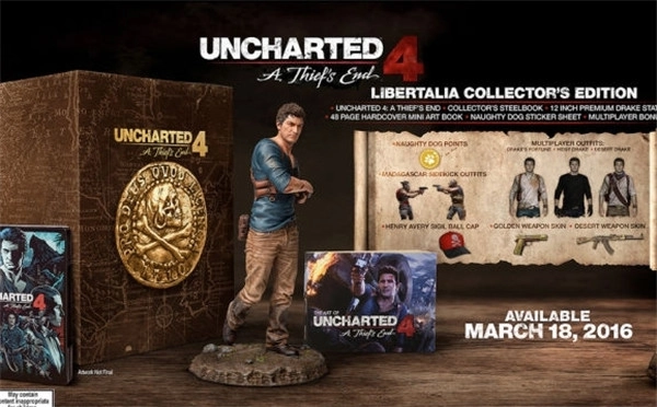 除了公布游戏的发售日期,顽皮狗还为预算充裕的玩家准备了两款限量珍藏版本,即“特别版”与“Libertalia珍藏版”(Libertalia是《神秘海域4:盗贼末路》的故事背景所在地)。其中“特别版”包含游戏本体之外的专属珍藏铁盒、48页的迷你艺术设定集、顽皮狗LOGO贴纸,以及多人游戏的额外奖励内容。而定位更奢华的“Libertalia珍藏版”,则在“特别版”的全部内容基础上,额外附赠一尊12英寸的德雷克主题塑像。