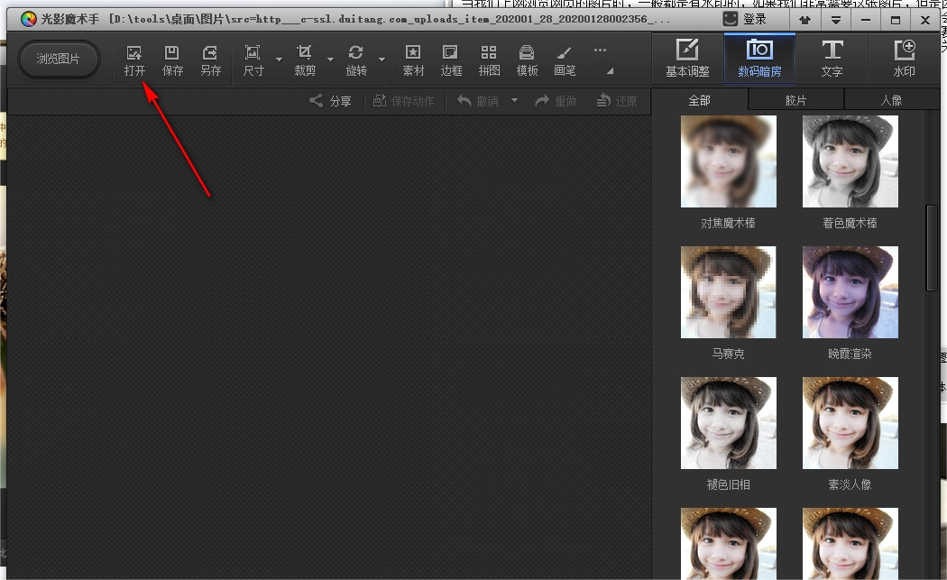 1. 请点击左上角的【打开】选项,把您的图片导入到这个页面。