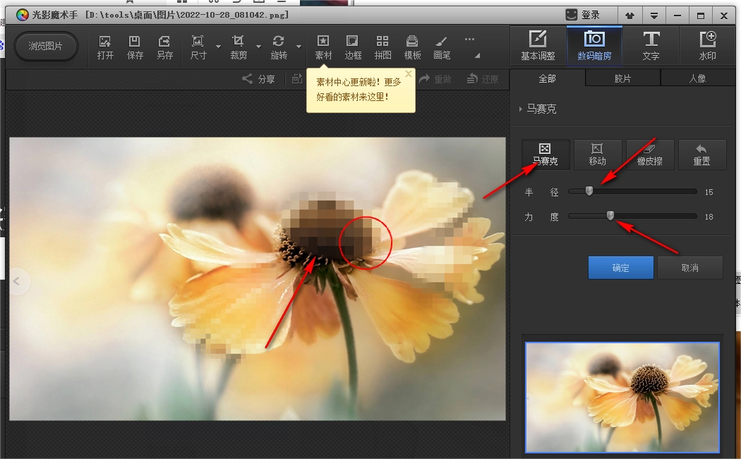 4. 选定马赛克功能后,您能够对【半径】与【力度】这两个参数进行调整,从而实现您理想中的马赛克效果。要是您希望打造出朦胧的美感,可将【力度】参数往左侧调小。完成参数调整后,您就可以在图片上需要处理的位置使用马赛克了。