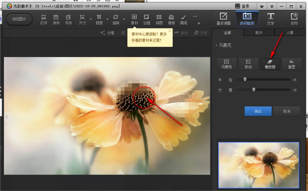 5.要是添加马赛克时选的位置不对,您只要点击【橡皮擦】工具,就能轻松把错误的地方擦掉。
