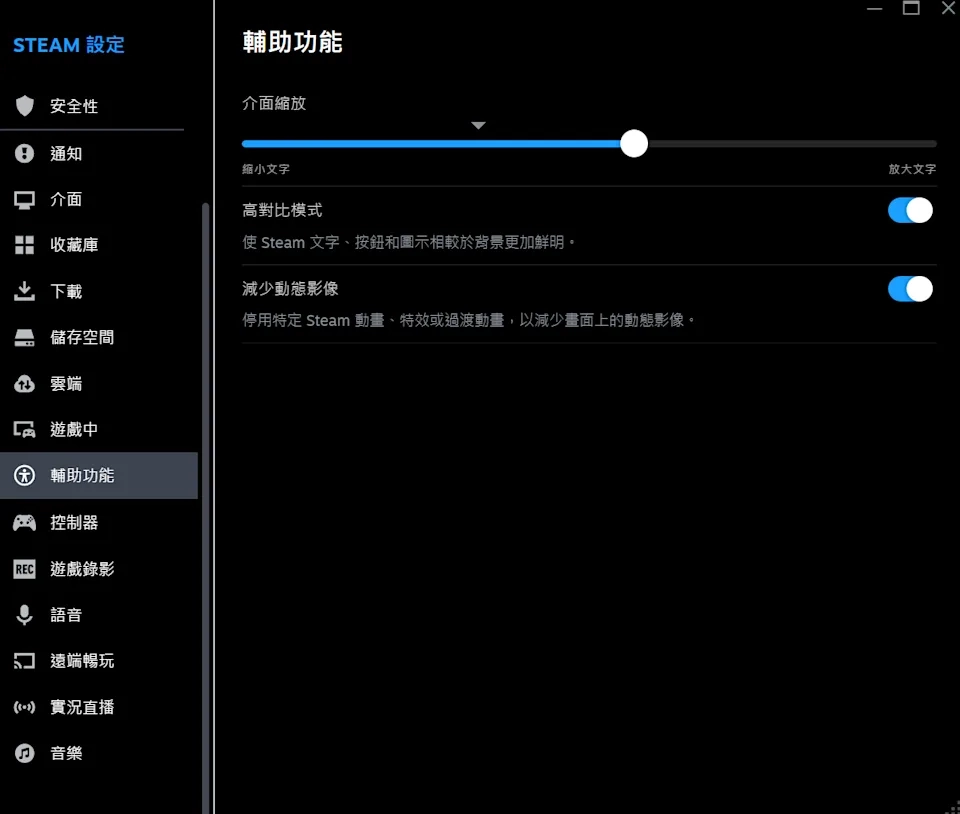 可以关闭动态影像,放大 Steam 文字。(图片来源:Steam)