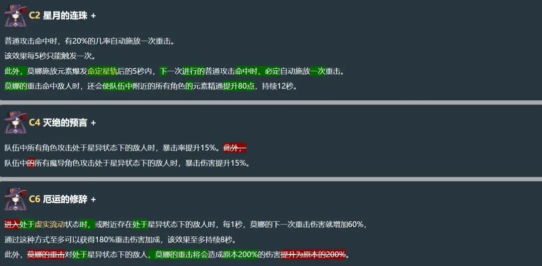 这个命座的改动有点让人摸不着头脑!通常莫娜开完大招后,玩家就该切换主C上场打爆发输出了,可这个命座偏偏加了个“后台角色触发上述水元素相关反应时,加成效果提升到原来的160%”的设定,实在是让人搞不懂设计思路……