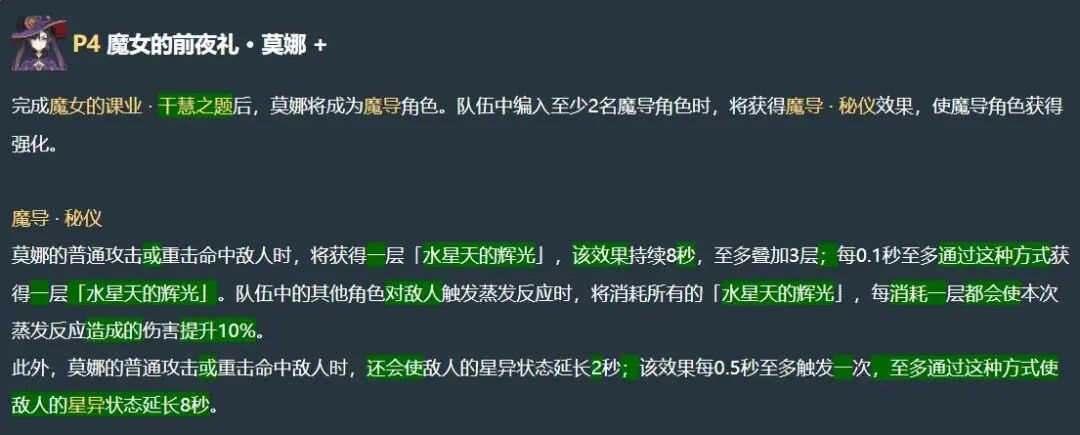 魔导天赋:普通攻击或重击命中敌人时,可叠加1层水星天的辉光效果,该效果最多能叠加至3层。当队友触发蒸发反应时,会消耗当前所有的水星天辉光层数,每消耗1层辉光,就能为此次蒸发反应提升10%的伤害。另外,使用普通攻击或重击命中目标,还能延长星异状态的持续时间,每次延长2秒,不过最多只能延长8秒。