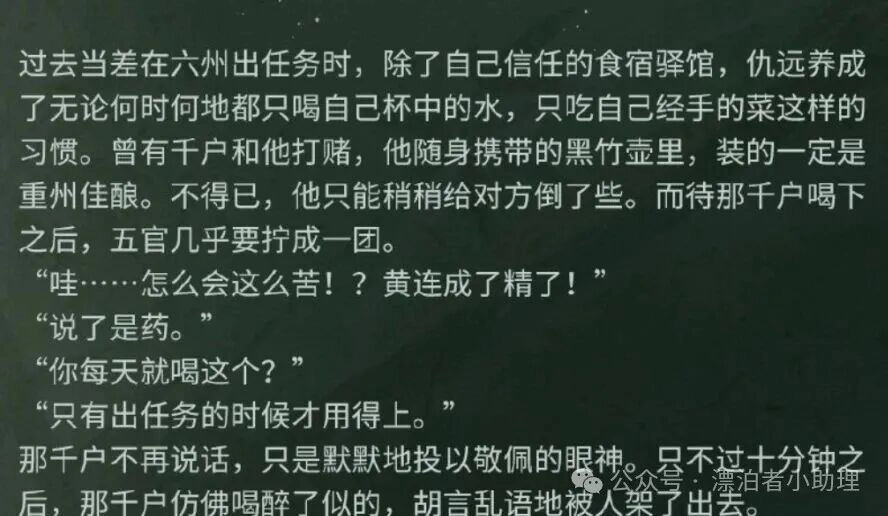 他总随身带着个竹壶,壶里盛着能催动心境与共鸣能力的药液。这药液滋味极苦,从前有位千户打赌说壶中是重州佳酿,尝了一口便直呼“黄连成精”,没一会儿还醉倒了——也难怪他只在出任务的要紧关头才肯喝,这位江湖浪客的“专属饮品”,确实够独特。