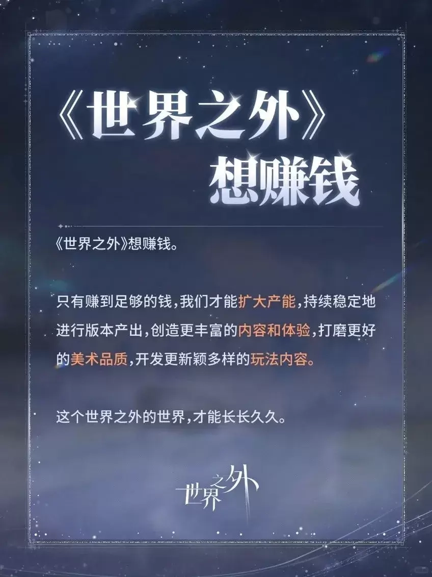 今年7月底,《世界之外》因新活动抽卡价格上涨等问题引发众多玩家不满。面对质疑,官方以“世界之外想赚钱”回应,却招致玩家更强烈的批评。此后,游戏流水出现大幅下滑。根据B站UP主GreenSpace的统计数据,该游戏7月流水超过7000万,后续则降至2000万左右。
