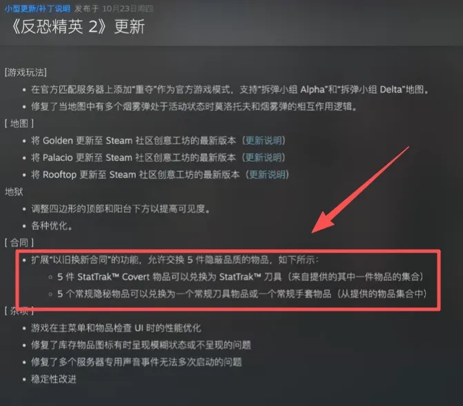 2025年10月23日,V社推出了《反恐精英2》的大型更新,此次更新中“汰换系统”的改版成为搅动市场的关键——以往那些只能靠0.26%开箱概率才能得到的金色刀具、手套等高端饰品,现在只需用5件红色品质皮肤合成即可获得,而且合成出来的物品还能自由交易。