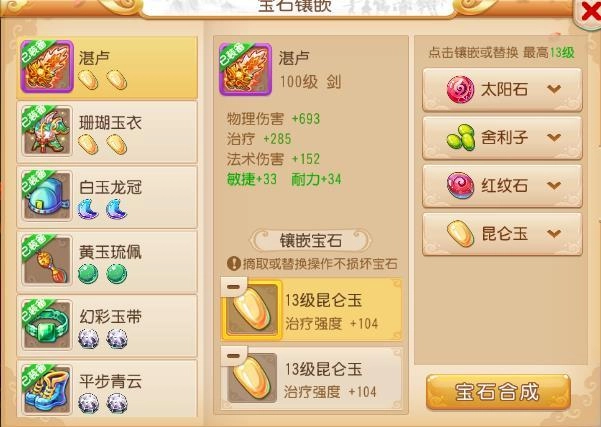 宝石镶嵌方面,主要推荐这样搭配:4颗昆仑石、4颗黑宝石、2颗月亮石以及2颗翡翠石。考虑到化生寺在队伍里扮演的是治疗角色,治疗强度和出手速度这两点都至关重要,因此需要选用4个昆仑石和4个黑宝石。