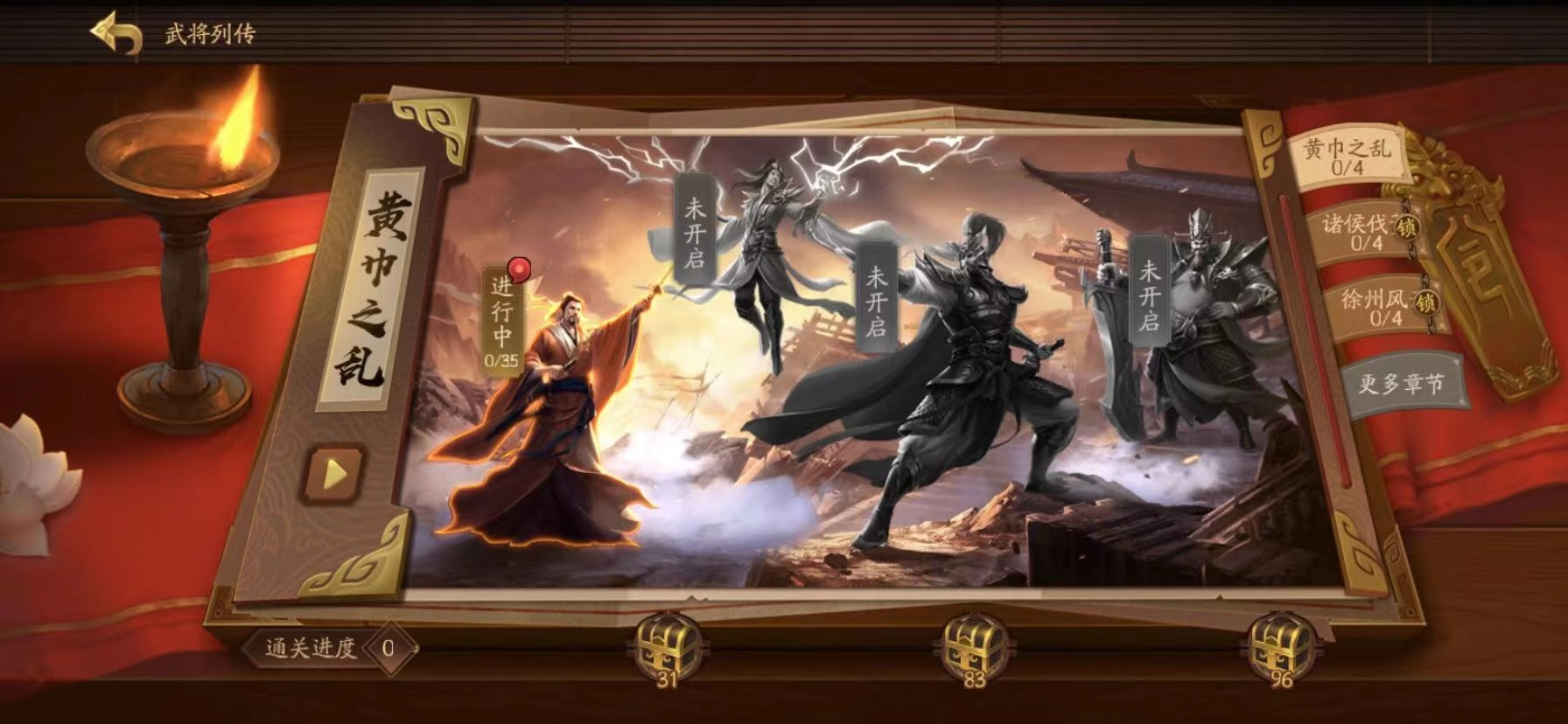 玩家得先选董卓来解锁直线关卡,这几个小关卡都是比较简单的基础关,不用太费精力。不过要注意的是,前期最好都选董卓,因为只有选了他才能避免出现很多buff,等最后把项羽击杀就能通关了。