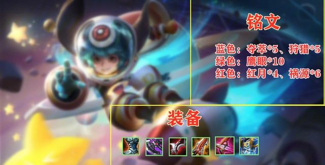 铭文:夺萃5狩猎5、鹰眼10、红月4祸源6。出装:急速战靴、暗影战斧、泣血之刃、无尽战刃、凌晨、贤者的庇护。