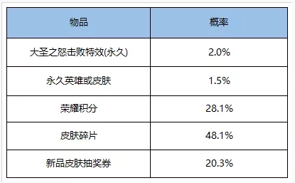 【礼包详情】:购买红蓝对决(1日),可额外获得以下奖励中的任意一项:孙悟空专属击败特效-大圣之怒(永久)、英雄孙悟空、皮肤地狱火、荣耀积分、皮肤碎片、新品皮肤抽奖券。