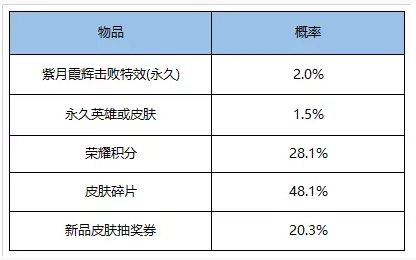 【礼包详情】:购买红蓝对决(1日),可额外获得以下奖励中的任意一项:露娜专属击败特效-紫月霞辉(永久)、英雄露娜、皮肤紫霞仙子、荣耀积分、皮肤碎片、新品皮肤抽奖券。