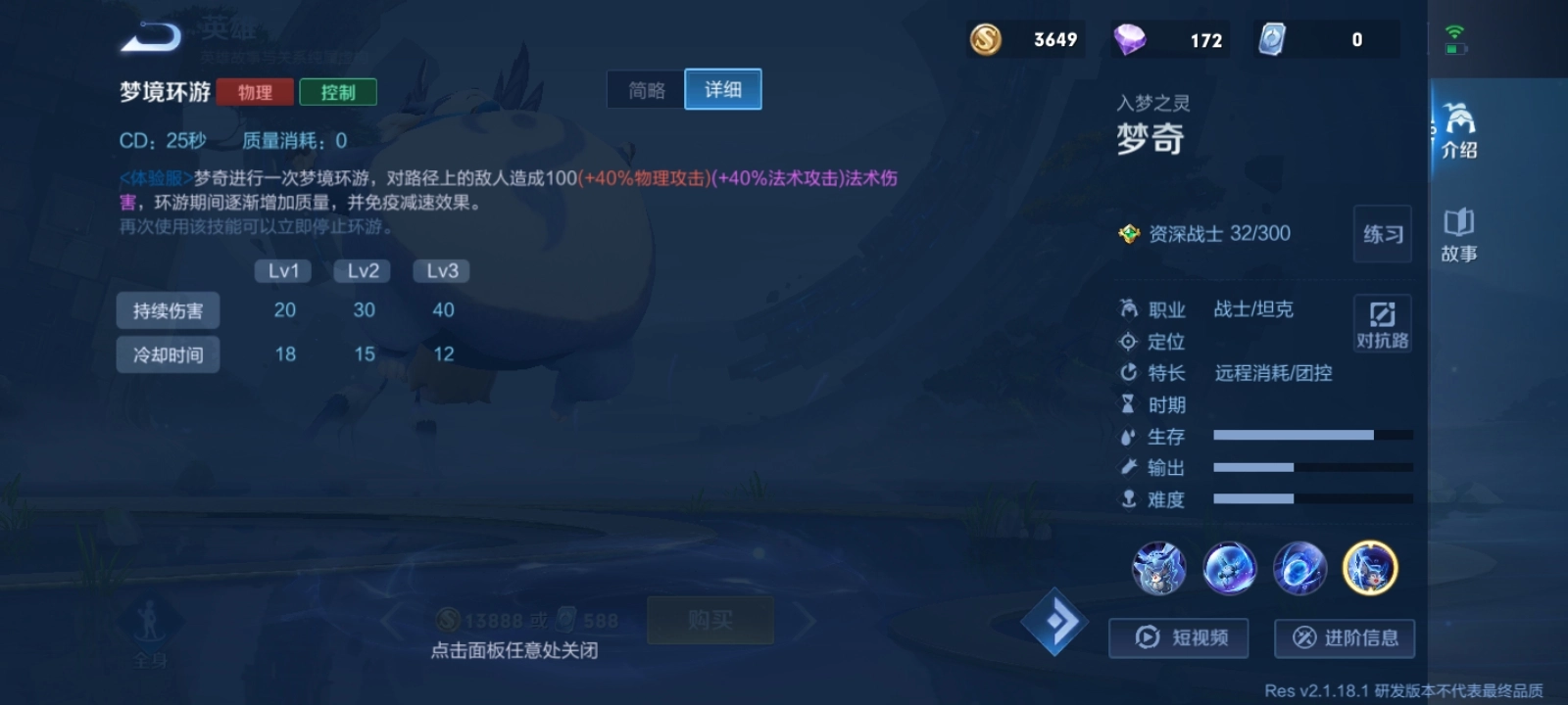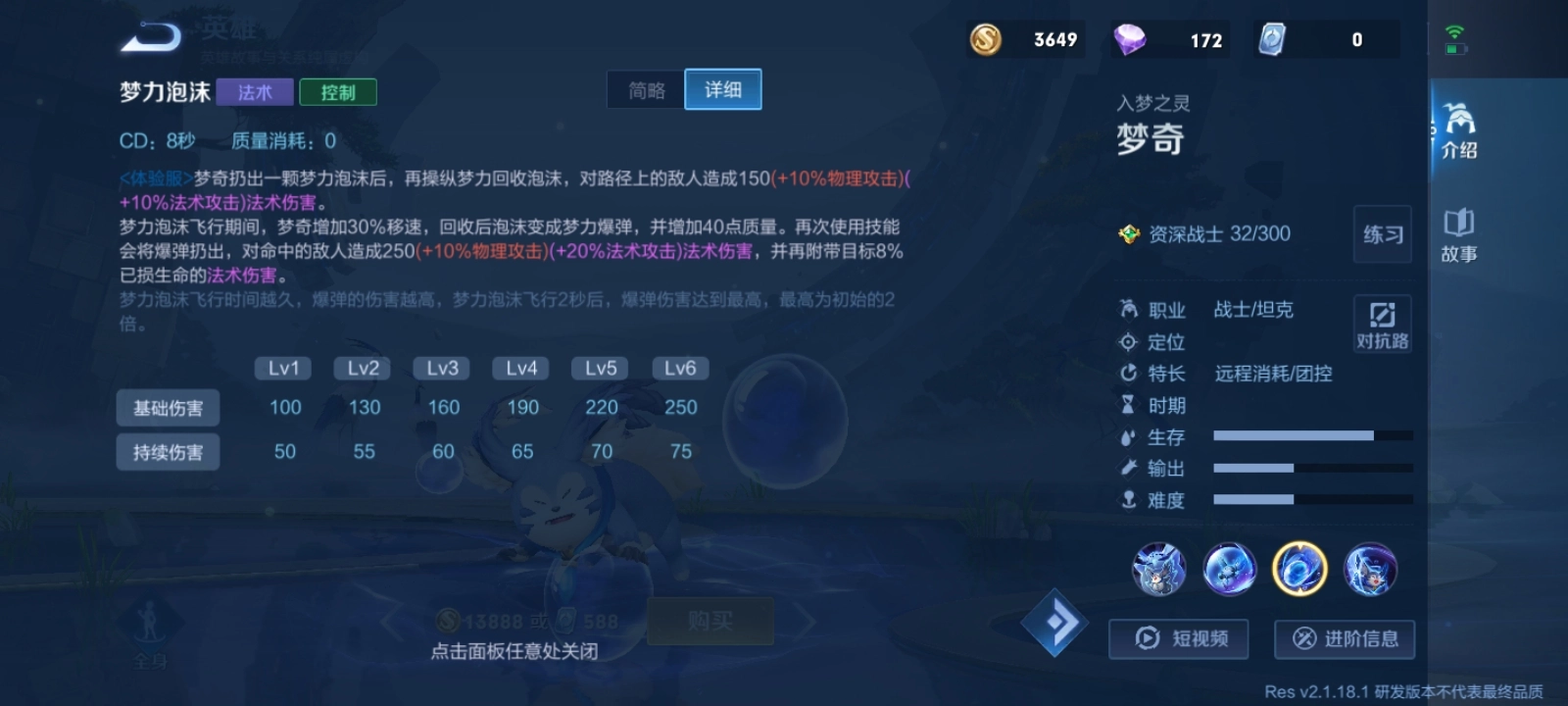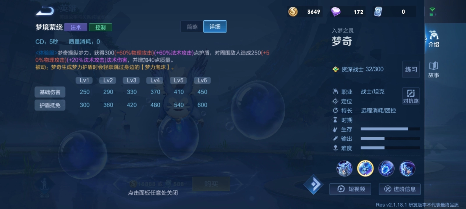 体验服梦奇的大招和正式服相比差异极大。正式服梦奇的大招核心作用是进场打控制,体验服的则更偏向于用来逃跑,虽说也能造成一些伤害,但即便是满级法装的状态,法术伤害也才1000点左右。