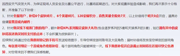 4、通过官方渠道公开活动抽中赠票的用户,同样可获得游戏内KPL限定皮肤作为补偿,官方会尽快公布相关细则并主动与用户取得联系。