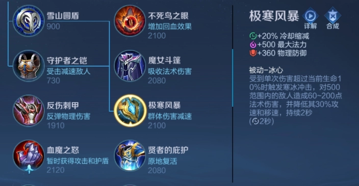 前面已经提到博学者之怒对明世隐的增益效果,接下来需要解决的是明世隐在技能冷却缩减方面的短板。由于到了游戏中后期,明世隐大招的治疗效果对射手或其他输出位置至关重要,大招冷却时间越短,其作用就越显著,因此极寒风暴成为了明世隐的核心装备之一。