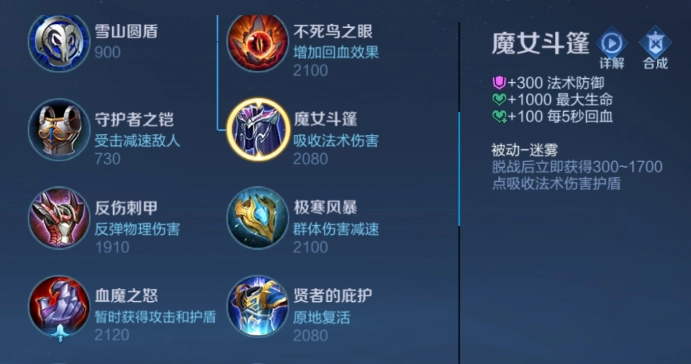 明世隐在法术防御装备的选择上相对容易决定,我首推的是魔女斗篷。这件装备能为他增加300点法术防御和1000点最大生命值,其被动效果还会赋予他一个可抵挡部分法术伤害的护盾。