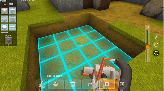 和清除笔刷不一样,它能清除选中区域上方的所有方块,我们可以用它来清理各类山坡,开辟出一块平整的空地。