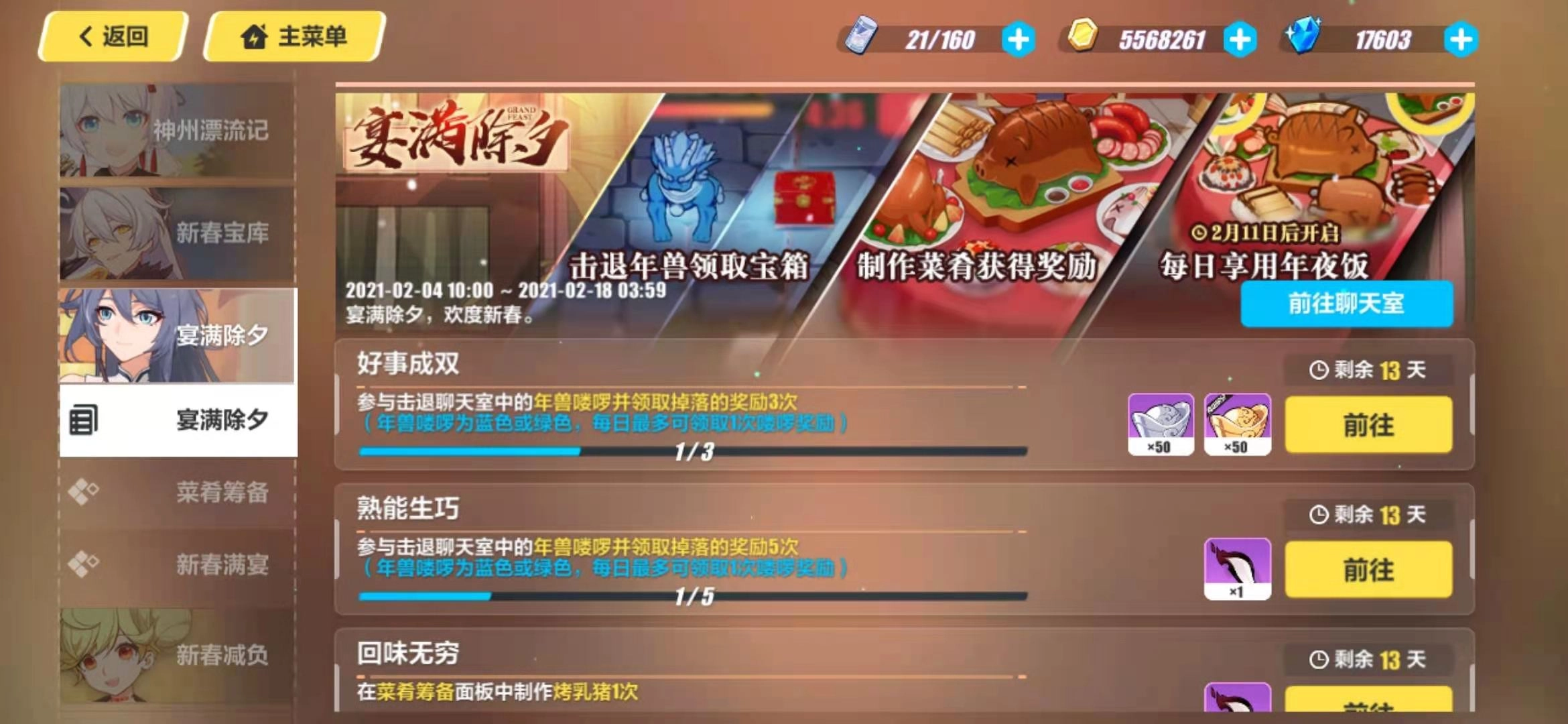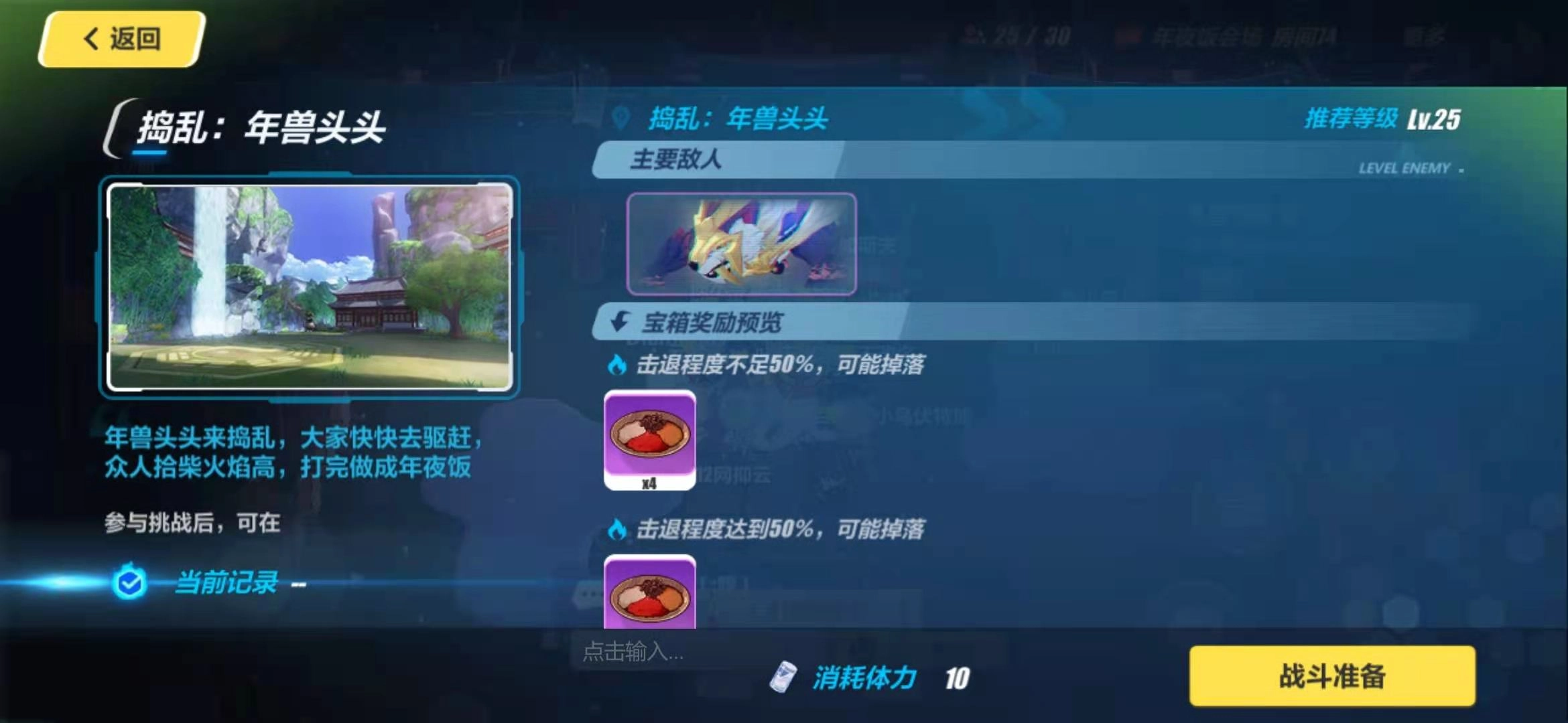 在挑战年兽的活动里,玩家得到的奖励是制作菜肴的食材,用这些食材来烹饪菜肴就能获取各类奖励资源。