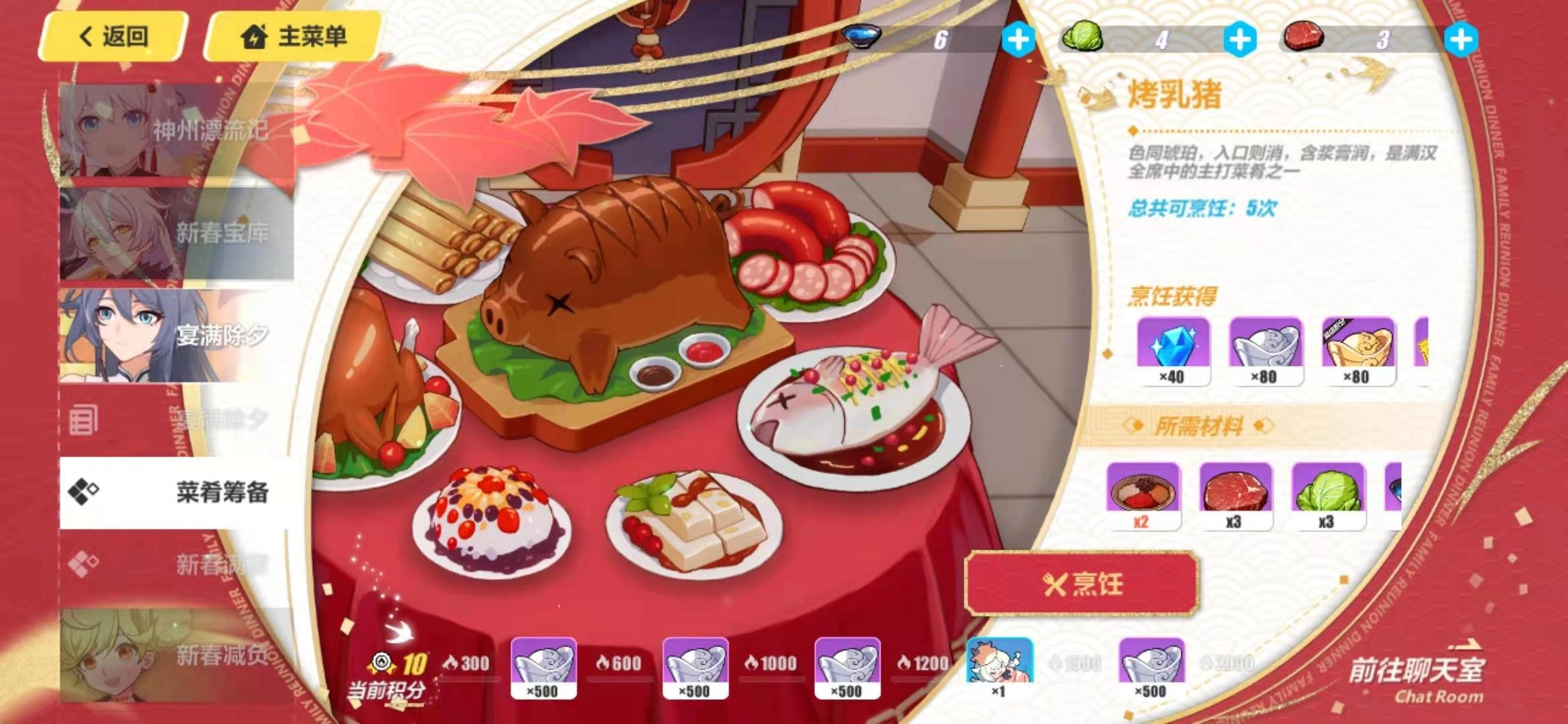 每种菜肴最多能制作五次,完成所有菜肴的制作总共需要三十次。在所有菜肴里,烤乳猪的奖励最为丰厚,每次制作成功都能获取水晶等奖励资源,而且活动的任务列表中也包含制作烤乳猪的任务。因此玩家最好优先将原料用于制作烤乳猪,等达到制作上限后,再依据自身需求考虑制作其他菜肴。