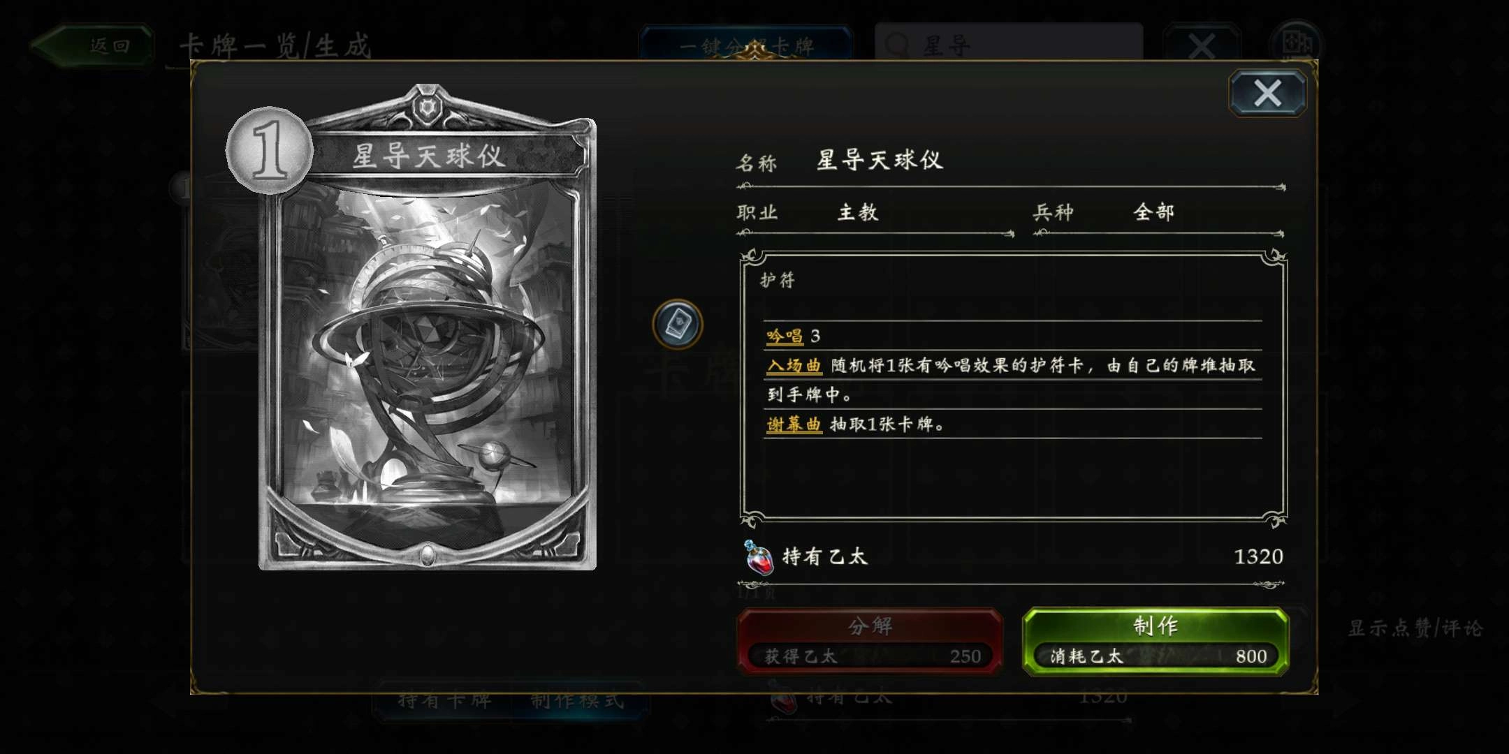星导天球仪则是一张具有检索效果的1费牌,是用来检索神圣祈愿这种护符用的,目的就是快速过牌。