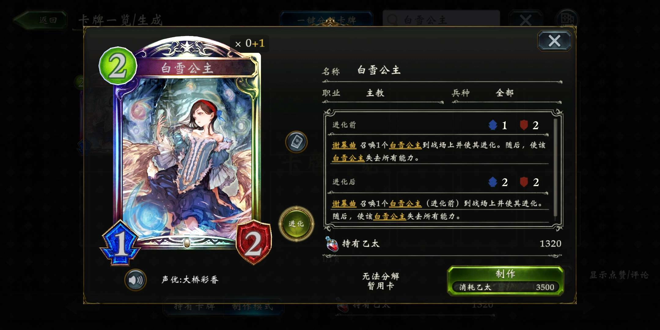 接下来为大家展示的是主战者的保护类卡牌列表。白雪公主在低费随从里属于功能性比较突出的一张,它在谢幕时会召唤出另一个白雪公主,并且让新召唤的白雪公主直接进化。这样算下来,花费2点费用就能得到一个1/2和一个2/2的随从,整体的性价比是相当不错的。