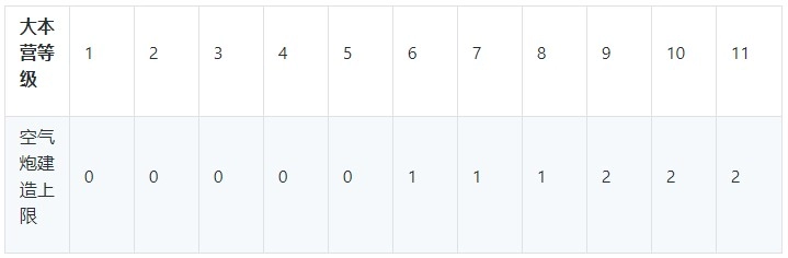 1、处于不同大本营等级时,空气炮能够建造的数量上限情况: