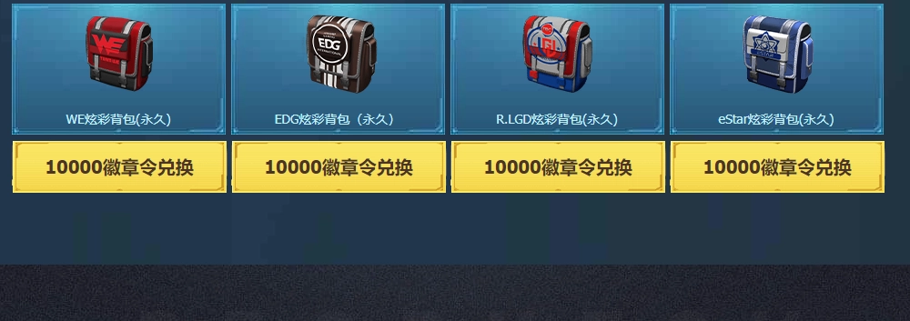另外还有部分物品需消耗一万点徽章令才能兑换,它们都是背包类道具,分别对应着WE、EDG、LGD、Estar等不同的游戏队伍。要是你恰好是其中某支队伍的粉丝,完全可以挑选一款自己最钟爱的背包来使用,而且背包的颜色支持自定义选择,不必担心会和他人“撞包”。