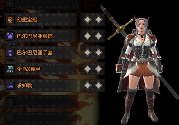四、直面怒涛的大将:幻想宝冠、巴尔巴尼亚服饰、巴尔巴尼亚手套、伞鸟X腰带、求知靴,这位威风凛凛的女大将军,模样十分帅气。