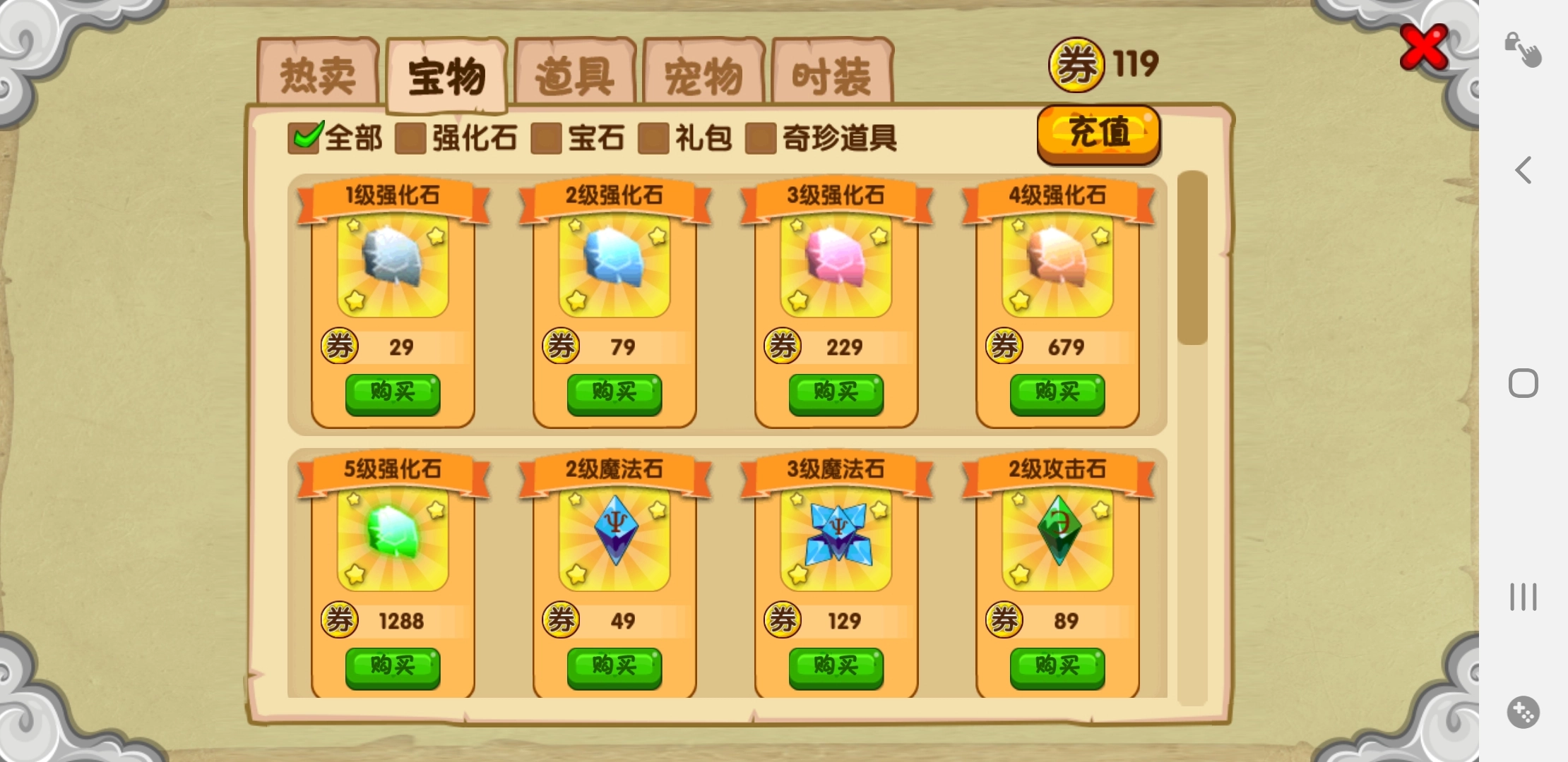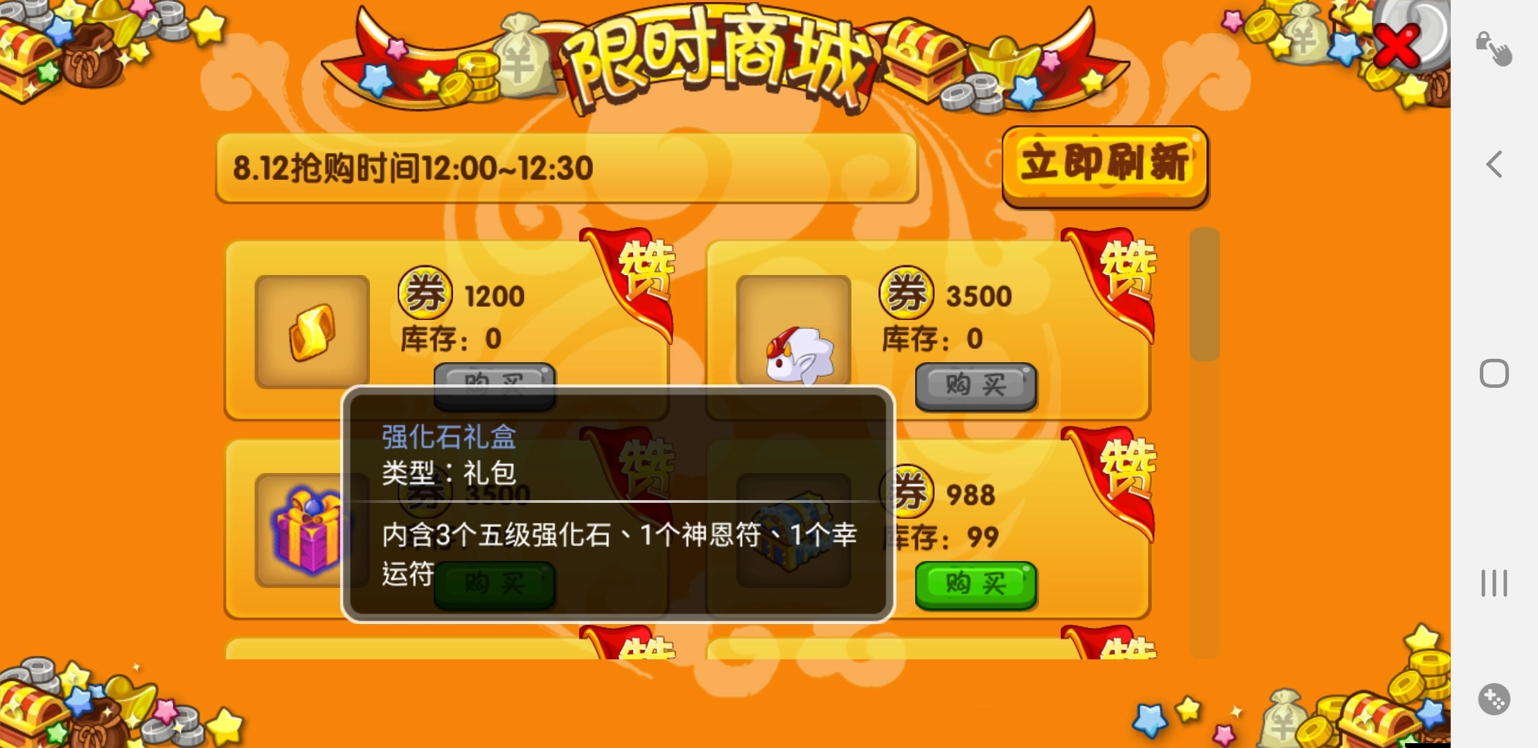 这里面的物品会频繁更新,并且很大概率能刷出强化石礼盒,礼盒里装有五级强化石和一些六级强化石。要是你运气好刷到了,可千万别错过这个机会。在这个限时开放的商店中,你还有可能刷新出六级乃至七级的强化石呢。