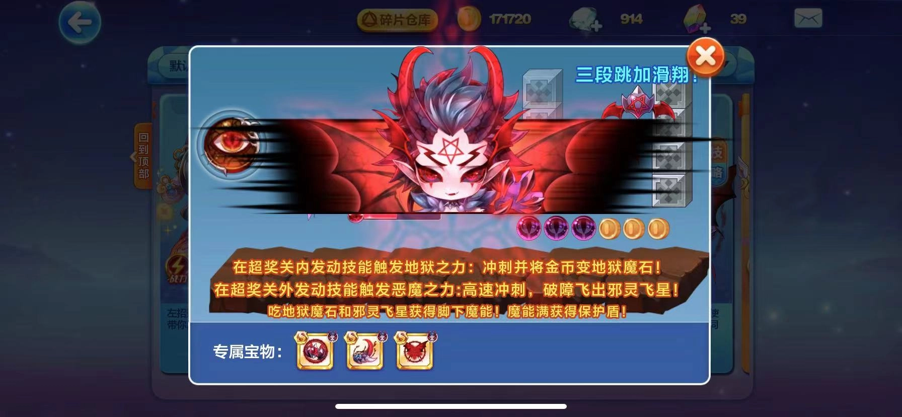 撒旦是一位速度型角色,凭借三段跳与滑翔的能力收获了众多玩家的喜爱。在超级关内释放技能时,他能触发地狱之力,冲刺过程中可将金币转化为地狱魔石;即便是在超级关外使用技能,也能激活恶魔之力,在高速冲刺状态下不仅能破除障碍,还能废除邪灵飞星。此外,收集地狱魔石和邪灵飞星都能积累魔能,当魔能数值集满后,玩家还可获得额外的保护罩。