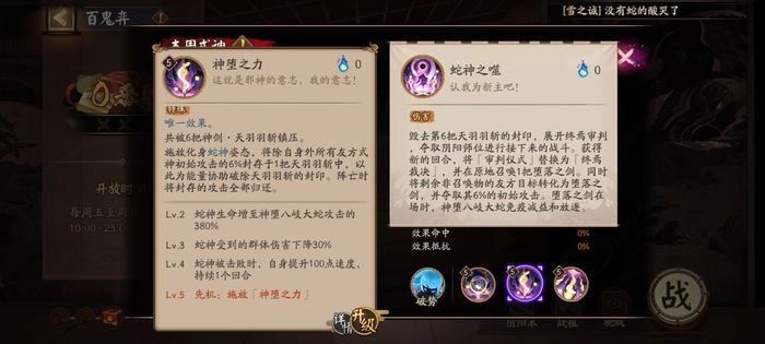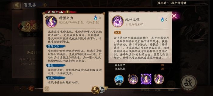 队友会转变为堕落之剑,该剑继承自身全部属性,不受任何控制与放逐影响;在自身回合时,能为自己恢复20%生命值,sp大蛇则获得15%行动条和1点鬼火。当封印破除至5层时,可篡位阴阳师以解除第六层封印效果,此时大招形态改变,同时原地生成一把堕落之剑,且会吸取其他队友6%的攻击力;只要有堕落之剑在场,大蛇便免疫减速与放逐效果。