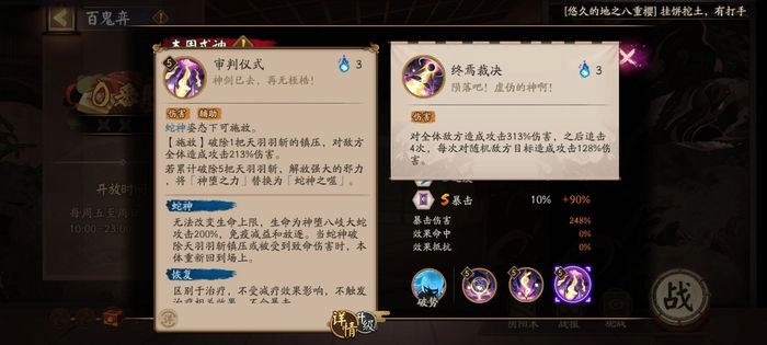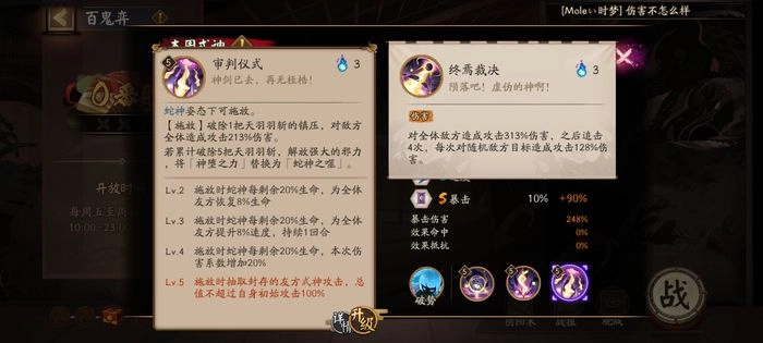上图展示的就是升级后的效果,能看到主要新增了恢复、提速、增伤以及攻击力加成的获取,因此随着封印破除层数的增加,sp八岐大蛇的伤害会愈发提高。它的终极大招伤害包含aoe和4段攻击,尽管游戏内的倍率不算突出,但结合伤魂鸟套的搭配以及大蛇吸取的攻击力来看,实战中的爆发能力依然十分强劲。