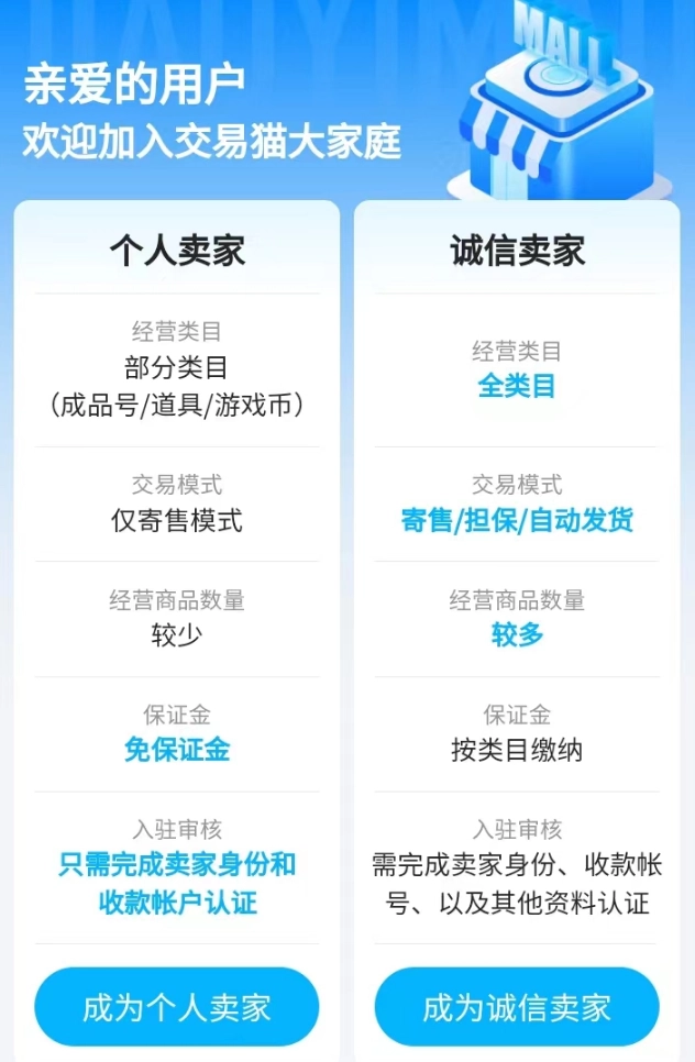 另外,平台考虑到有些玩家打算脱坑卖号,所以也为大家提供了卖家身份的申请渠道。要是各位出售的游戏账号数量不多,小编优先建议大家选择个人卖家身份。这个身份的申请流程很简单,而且不需要缴纳押金就能获得卖号权限。